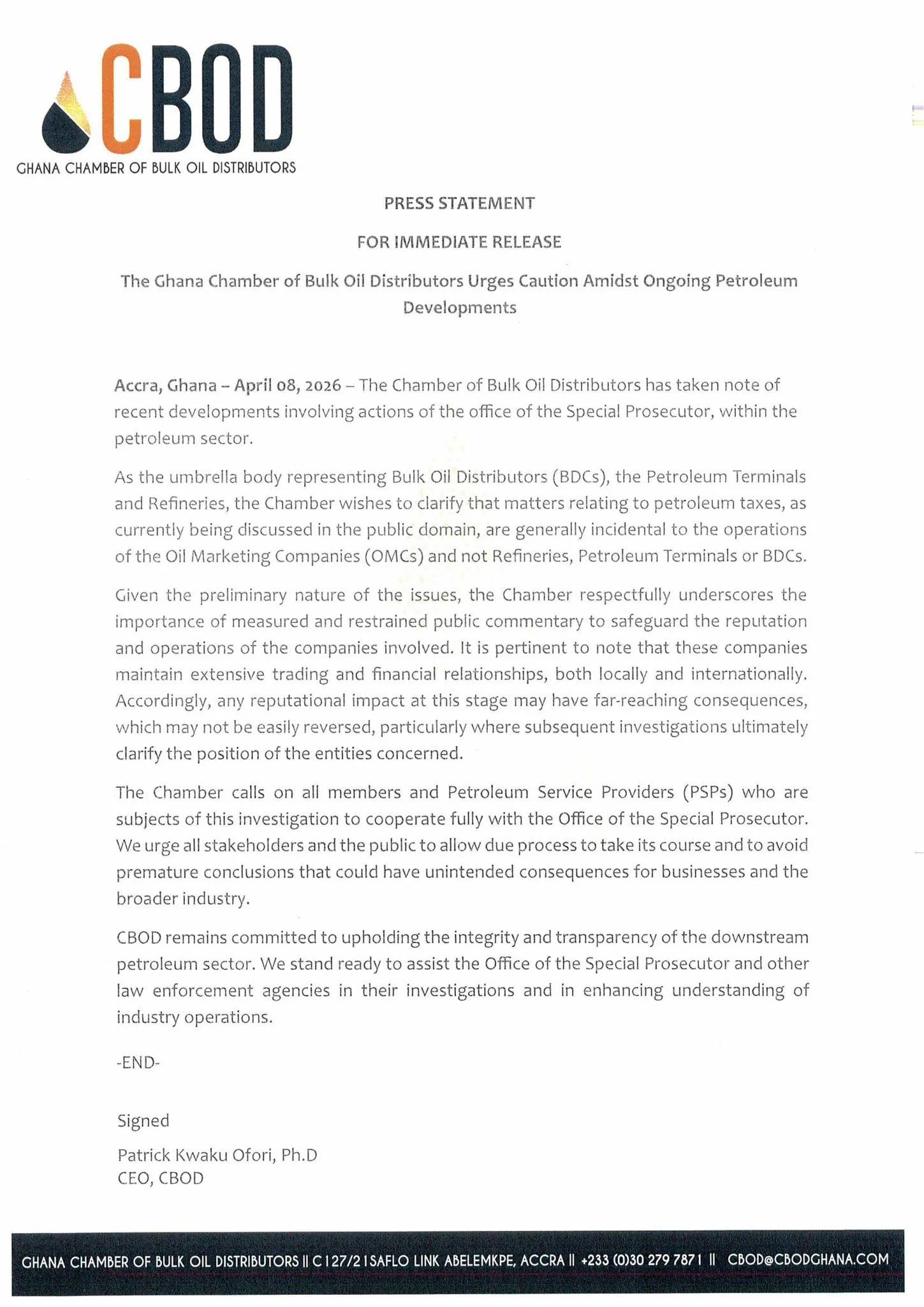 Accra, Ghana – April 08, 2026 – The Chamber of Bulk Oil Distributors has taken note of recent developments involving actions of the office of the Special Prosecutor, within the petroleum sector.